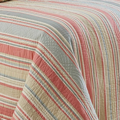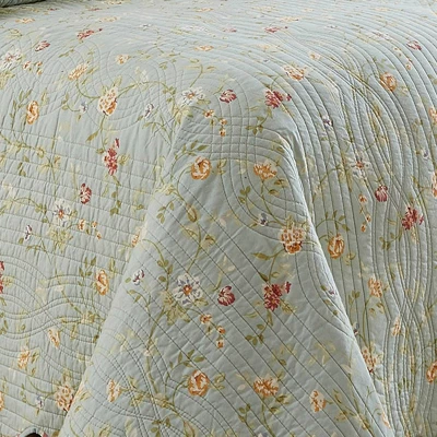 Bring your bedroom to life with the Waverly Garden Glitz 3 Piece Bedspread Collection. The allover petite vine and floral pattern comes to life in soft spa tones of vapor blue, parchment, ivory, seafoam green, and blush pink and reverses to coordinating stripe. Bedspread and shams feature four scalloped edges for luxurious style. Queen set features a 96 x 110 reversible bedspread and two 21x 26 reversible standard shams. King set includes a 110 x 120 reversible bedspread and two 21×36 reversible king shams. Machine washable for easy care. Wash in cold water on the gentle cycle and tumble dry on low for optimal care and long lasting beauty. Complete your designer look by layering on coordinating accent pillows and lined window treatments, all sold separately.
