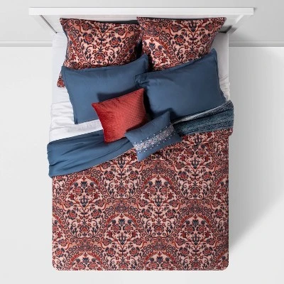 Introduce warm colors and patterns to your bedroom decor with the Threshold™ Monson 8-Piece Comforter Set. Made from a soft and breathable twill fabric, this multi-piece bedding set includes everything you need to transform your bedroom into a cozy haven that provides year-round comfort. The comforter is adorned with a lovely floral-medallion print in blue and red on a rose background to lend timeless style to your space. The solid blue reverse adds an elegant pop of contrast, and the two matching printed shams and two solid blue shams complete the traditional comforter set with sleek style. It also comes with two decorative pillows in red and blue with quilted accents and medallion motifs, as well as a solid blue bed skirt, to provide the perfect finishing touch to your bedscape.