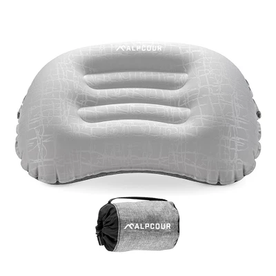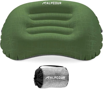 Experience superior comfort on your outdoor adventures with the Alpcour Ultralight Inflatable Camping Pillow. Compact yet plush, this inflatable pillow folds down smaller than a soda can in seconds, making it a perfect travel companion for backpacking, hiking, beach lounging or plane travels. The soft fabric mimics the coziness of down and conforms like memory foam, offering ergonomic support for your neck and back to provide soothing comfort for back, side, and stomach sleepers.Forget about complicated inflating processes; our advanced quick deflate technology enables you to blow up the pillow in just 3-5 breaths, and it self-deflates with a simple press of a button. This easy-to-operate air valve system is suitable for both adults and kids.Designed to stay in place throughout the night, our camping pillow features durable, rugged material with anti-slip rubber dots to enhance friction against any sleep surface. The set also includes a removable latch strap for attaching the pillow to an inflatable pad or mattress for added convenience.Despite offering XL comfort, the Alpcour Camping Pillow is incredibly lightweight and compact. It folds down into the included bonus storage bag for easy carrying in a backpack, luggage, beach tote or hiking pack. Choose from our selection of multiple sizes and colors to meet your specific needs and preferences. Get ready for a good night’s rest, no matter where your journey takes you!