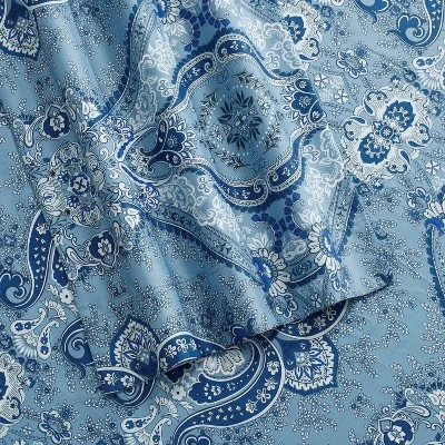 This printed cotton sheet set is crafted from soft 300 thread count 100% cotton long staple fibers. Made with a sateen weave. This sheet set features a stylized medallion and paisley in a range of blues. Includes a generous sized flat sheet and a deep pocket fitted sheet to fit most mattresses up to 22″ deep.