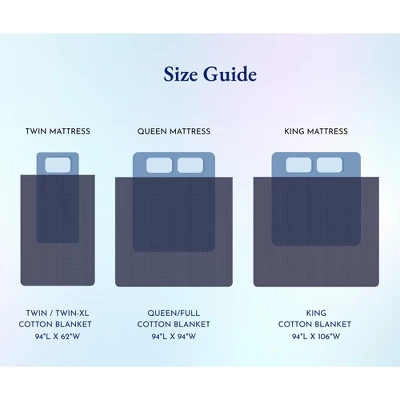 - Lightweight & cozy cotton thermal blanket that is perfect for every season. This King -size blanket measures 106″ x 94″ L.