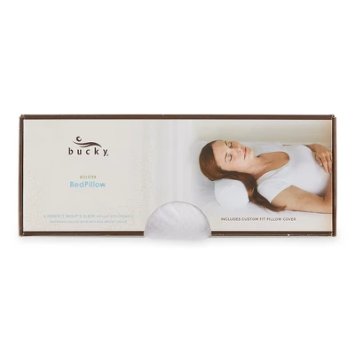 - Bucky bolster pillow is 16 inches by 6.5 inches in size, perfect support for your low back when seated or head and neck when sleeping, high-quality quilted cotton pillow case included.