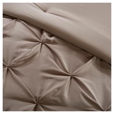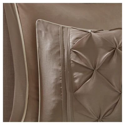 Invigorate your space with the Madison Park Essentials Joella 24 Piece Room in a Bag. The lavish tufted details flaunted on the comforter, shams, and window valances deliver an elegant statement in bold, natural hues. A large border frames the luxurious comforter, adding charm and dimension to the bedding set. Matching shams echo the motif seen on top of the bed, creating an elegant look in your space. An included microfiber sheet set and bed skirt complements the bedding collection and offers exceptional comfort and style. Two Euro shams and four embroidered decorative pillows help to complete the bedding set, giving it a finished look. Accompanying this bedroom set are four window panels with four tie backs to keep curtains drawn open, while two tufted valances provide the finishing touches to your bedroom. This bedding set may come in rolled or compressed packing and will need to be fluffed up. Use a steam iron to help remove wrinkles easier.