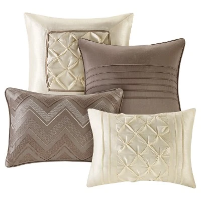 - Decorative pillows have embroidery and pleating details