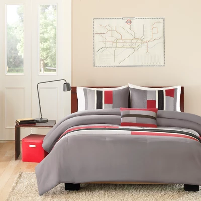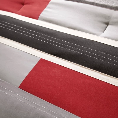 The Maverick Comforter Set offers a fresh update to your room. The ultra-soft microfiber comforter boasts a striped pieced design in bold colors, for a casual look with an urban feel. Top stitching and twill tape details highlight the design, creating an eye-catching contrast. Coordinating sham(s) and one decorative pillow reiterate the comforter’s design to complete the slick ensemble. Machine washable for easy care, this comforter set provides a fun and stylish update to your bedroom.