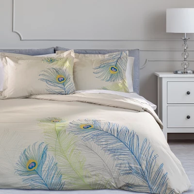 Update the look of your bedroom with the alluring Polka Peacock Duvet Cover Set. Crafted from quality, 100% Cotton with a soft 200-thread count, this lovely set provides a peaceful night’s sleep. This trio includes 1 duvet cover with a clear, hidden button closure and 2 pillow shams. Available in your choice of white or silver that boast a subtle shimmer from their sateen weave and display colorfully embroidered peacock feathers, it’s easy to add an exotic feel to your space. This set is machine washable and wrinkle-resistant. Transform your bed into a relaxing retreat by adding matching sheets and extra pillowcases, sold separately.