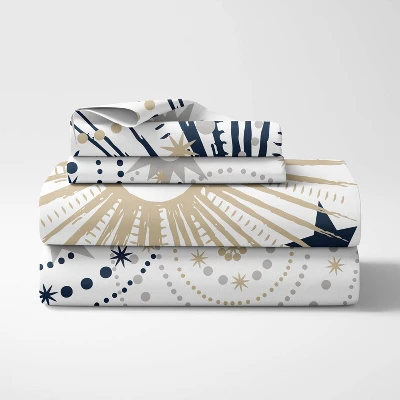 Navy Blue and Gold Celestial 4 Piece Queen Sheet Set will help complete the look of your Sweet Jojo Designs room. This navy blue, gold and gray stars and moons celestial print brushed microfiber fabric sheet set fits all standard queen size mattresses and is machine washable for easy care. Queen Sheet Set Includes: Fitted Sheet, Flat Sheet and 2 Pillow Cases.
