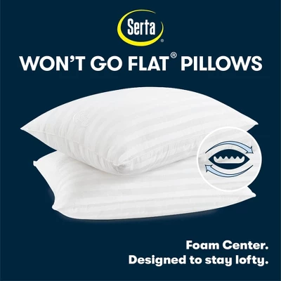 Indulge in a night of deep sleep with the ultimate head and neck support! Our Won’t Go Flat Pillow offers both softness and support for any sleep position. Made from exceedingly soft, durable and lightweight 300 Thread Count Cotton Fabric that will retain its softness wash after wash. Our standard/queen size pillows feature stain release technology for easy stain removal in the wash. Allergen barrier weaving prevents dust mites and other household allergens. Machine wash cold, gentle cycle. For best results, use a front loading machine. Wash with like colors only and use non-chlorine bleach when needed. Run spin cycle twice, for maximum water extraction. Tumble dry low heat with clean tennis balls. Remove promptly and fluff after drying. Do not iron. A champion of comfort for all, Serta has pioneered sleep innovation for more than 90 years in more than 150 countries. Every Serta bed is designed to provide superior comfort, including the award-winning Perfect Sleeper and iComfort collections.