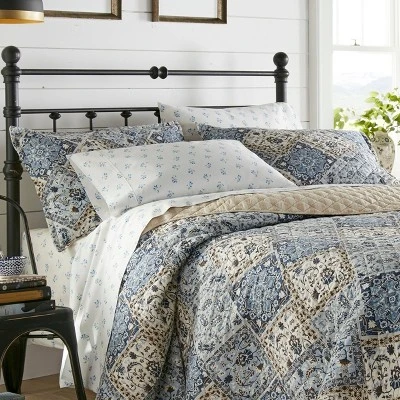 Perk up your style game with a quick and easy country casual makeover for your bedroom. This soft, prewashed cotton quilt set is lightweight yet warm and will get softer and more comfortable with each washing. The design features a patchwork-inspired print with an updated attitude. Patterned blocks arranged in a diamond layout have overlapping edges that soften the geometry and add to the relaxed mood. A classic blue and white palette looks fresh and new with chocolate and beige accents and the quilt reverses to a simple beige cabana stripe. An allover diamond quilt stitch enhances the loft, increasing warmth and overall comfort. Twin Quilt Set includes: One twin quilt (88″L x 68″W) and one standard sham (21″L x 27″W), Full/Queen Quilt Set includes: One full/queen (90″L x 90″W) and two standard shams (21″L x 27″W), King Quilt Set includes: One king quilt (96″L x 104″W) and two king shams (21″L x 37″W)
