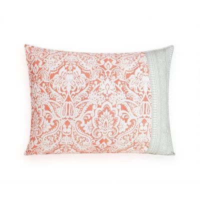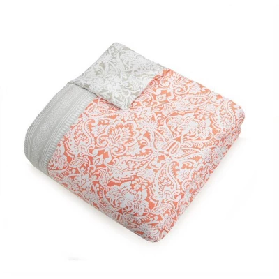 Rejuvenate your bedroom style with the Jessica Simpson Coral Gables Comforter set. The comforter features a painterly damask print on 100% cotton. The face features the damask a lively coral and the reverse is the same damask print in dusty gray. Coordinating decorative pillows sold separately. This comforter set is machine washable.