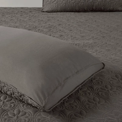 The Vancouver 3 Piece Quilted Bedspread Set offers a charming cottage-inspired update to your bedroom. The open split-corner fitted bedspread and shams flaunt a classic stitch pattern that creates a rich depth and texture on the face of the bedding set.